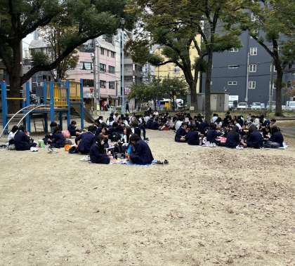 天気がよければ靱公園でお弁当のはずでしたが、雨予報でしたので劇場近くの公園で素早くお弁当をいただきました。保護者のみなさん、早朝からありがとうございました。