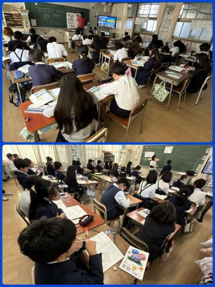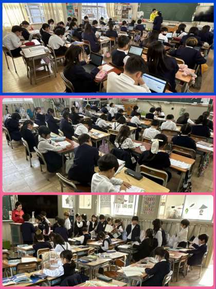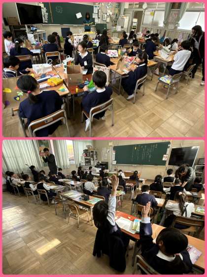 1年1組図画工作は4人一組でグループになって作品づくり。一人一人が自分の紙袋に色とりどりの紙をペタペタ。だんだんとステキな紙袋が出来上がってきました。