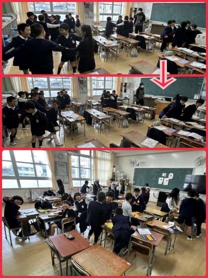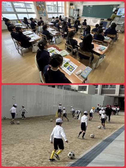 2年1組音楽の学習。4人組や5人組に分かれて、わらべうた『なべなべそこぬけ』にチャレンジ。♪そーこがぬけたら かえりましょ♪と歌いながら、なかなか帰ってこれないグループも。ワイワイ楽しく学習する1組のみなさんでした。