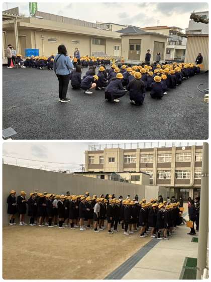 2時間目に地震と津波の避難訓練を実施しました。地震が収まるまで頭を隠し、外に避難。津波が来る恐れがあるため、3階以上へ避難をしました。担任からの指導もあり、全員が真剣に素早く行動できていました。
