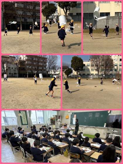 図画工作の学習で凧に絵を描いた1年生。順番に凧上げに取り組んでいます。今日は3組が三津屋公園に行って凧上げをしました。大空高く舞い上がれ〜!
