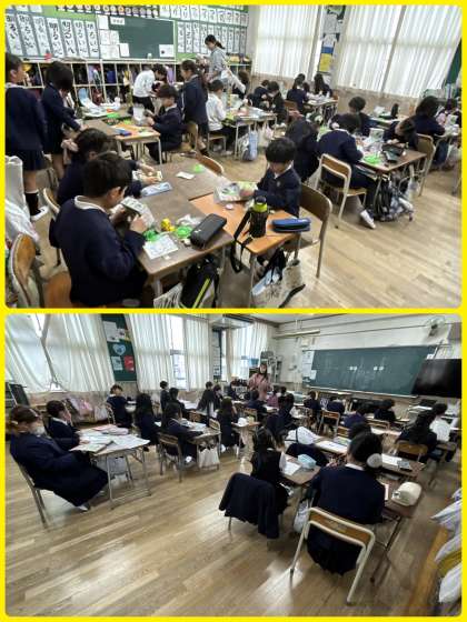 4年2組理科は「もののあたたまり方」の学習。水はどのようにあたたまっていくのか、ビーカーに入った水の動きを示温インクを使って調べていました。結果とわかったことを覚えておきましょうね。