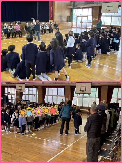 三津屋老人クラブのみなさんをお招きして1年生が昔遊び体験を行いました。「けんだま」「おはじき」「はごいた」「お手だま」「こま回し」「だるまおとし」の6つ遊びをグループごとに教えていただきました。難しいものもあったようですが、笑顔いっぱい楽しく活動できていました。
