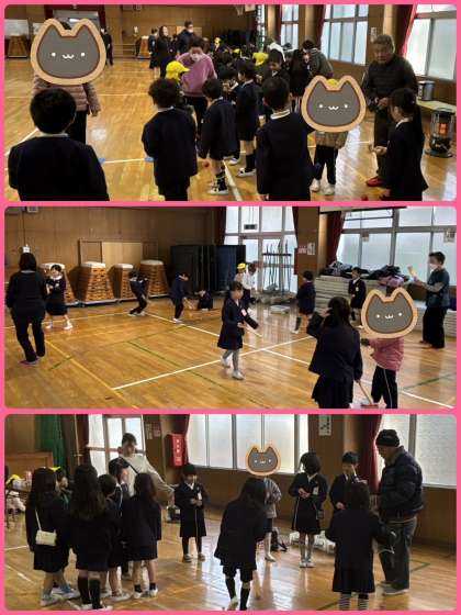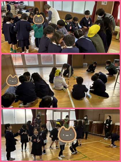 2時間目は1組4組が昔遊び体験。まことよどがわ保育園の年長さんも一緒に昔遊びを楽しみました。