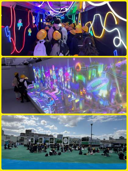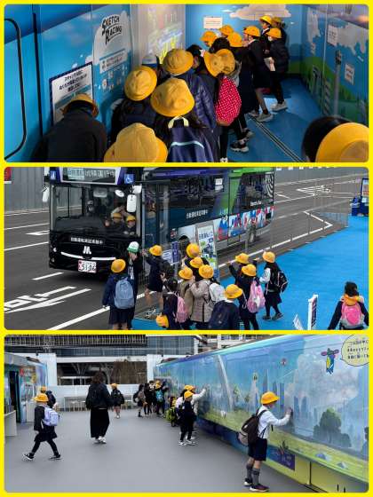 自分が描いたモビリティがスキャンされ映像に。そこで友だちとレースができるアトラクションを体験したり、自動運転バスにも乗りました。
