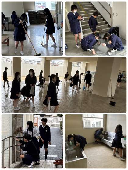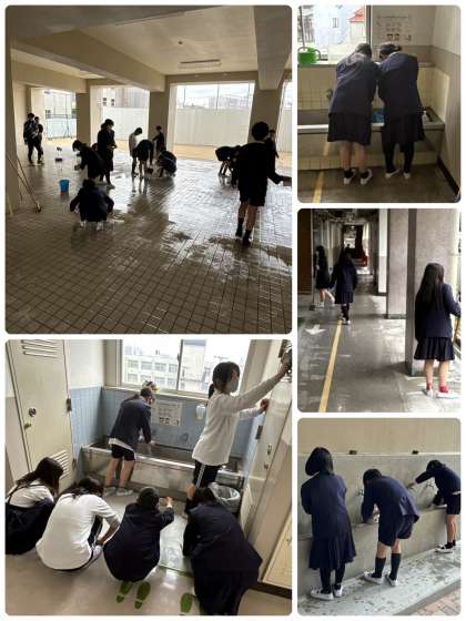 5・6時間目、6年生がお世話になった学校に感謝の気持ちを込めておそうじをしてくれました。北校舎、南校舎、新校舎、給食室などたくさんの場所を分担して取り組んでくれました。ひざまずいて汚れた床を拭いたり、普段はなかなかできない壁や窓、手洗い場もゴシゴシと磨いてくれました。