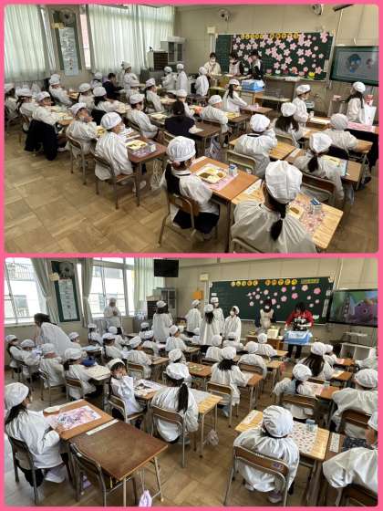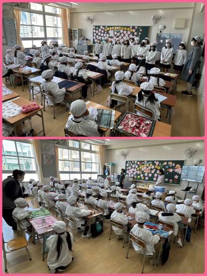 手洗いをして、ナフキンを用意し、エプロンを着て、準備もばっちりです。ここで、強力な助っ人が!6年生のおにいさん、おねえさんが給食を運びに来てくれました!