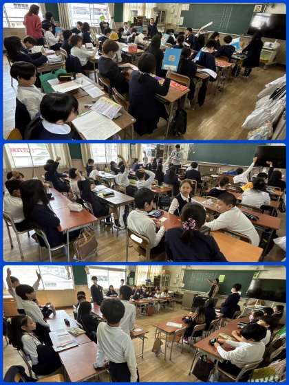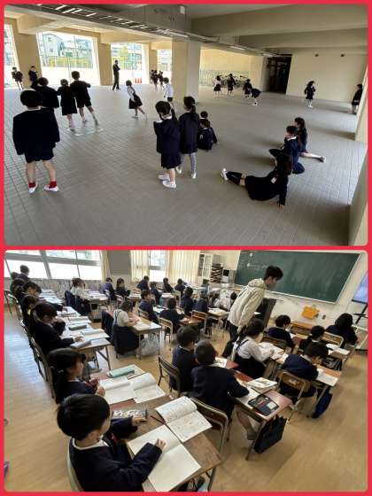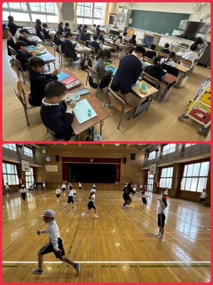 2年1組は「だるまさんがころんだ」。4組は講堂で楽しく体育の学習。新しい友だちはできたかな。