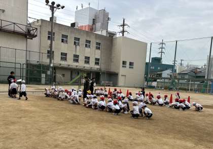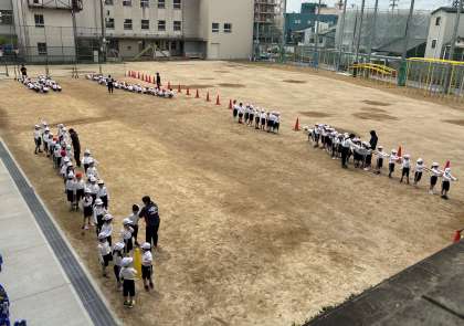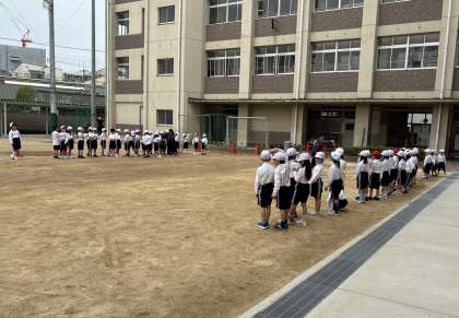 1年生は体操服に着替えて運動場へ。二測定も終わりましたのでクラスごとに背の順の並び方を教えてもらっていました。1列、2列、4列。来月には遠足も控えています。何度も何度も練習していきましょう。