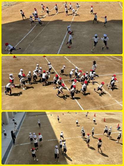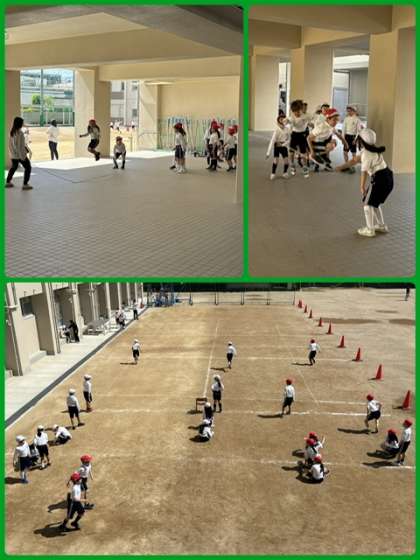 体を動かすと、少し汗ばむくらいの気候の中、少し広くなった運動場やピロティーで体育の学習に取り組んでいました。
