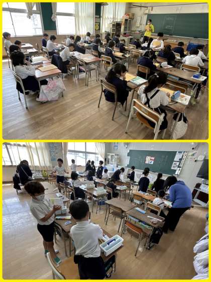 3年生図画工作科の学習は「色のリレー」。ちがう色でスタートして白いバトンにつなげます。思い通りにできたかな。理科の学習は虫メガネを使って、ホウセンカやマリーゴールドの種の観察。新しい発見があったかな。