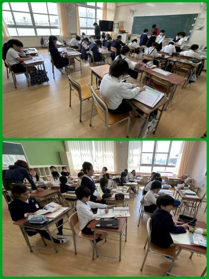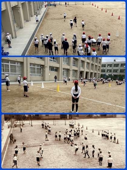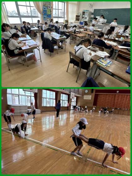 4年4組は講堂で体づくりの運動。5年生は運動場で走や跳の運動。来月にはスポーツテストも行います。一人一人が目標を持って少しずつ体を動かしていきましょう。
