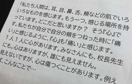 今日の児童朝会を少し延長して「いじめ」「いのち」について子どもたちに話しました。