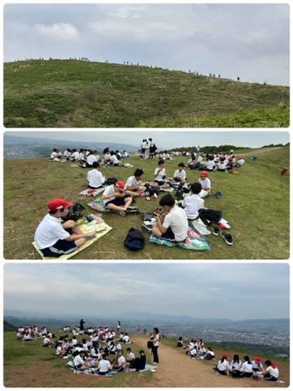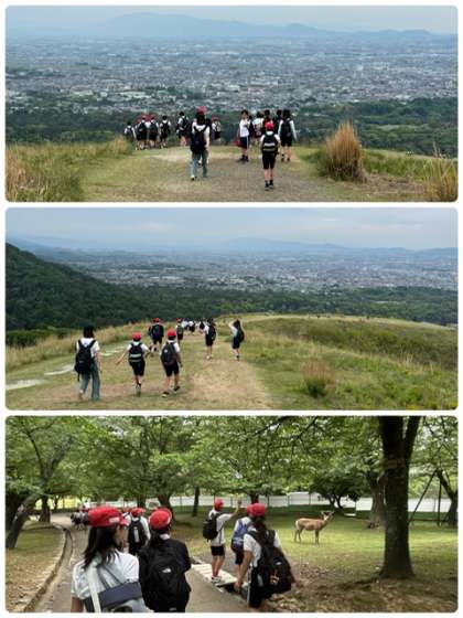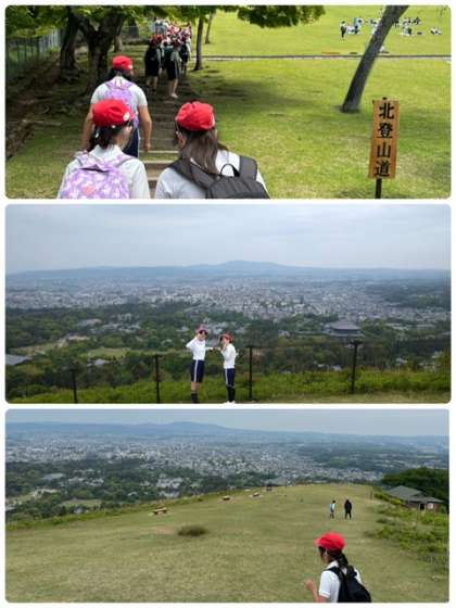 若草山登山。一重目頂上と二重目頂上。自分の目標に向かって、自分のペースでそれぞれががんばりました。一重目頂上が目標だった人も「がんばってみる」と二重目頂上にチャレンジ。見事登り切りました。よくがんばりました。林間学習では雨でできなかった登山。リベンジ達成です!!