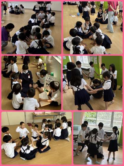 1組ペアは多目的室で顔合わせ。学校たんけんに向けて、楽しく交流していました。本番が楽しみですね。