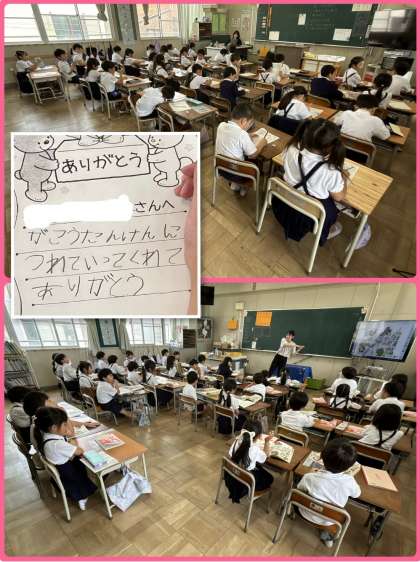1年生は学校たんけんのふりかえり。3組、4組では、2年生へお礼の手紙を書いていました。習いたてのひらがなで一生懸命に書いていました。思いが届きますように。