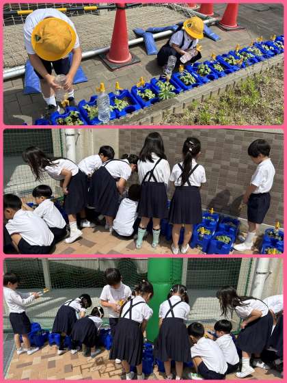 一人一鉢で育てているアサガオ。種まきした芽が出てきました。「こうちょうせんせえ〜、わたしのみて〜」と自慢の芽を見せてくれました。水やりにもさらに熱が入っています!