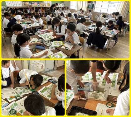 理科の学習ではちょうちょの幼虫を観察しながら育てています。虫眼鏡でじっくり見たり、長さを測ったり。中にはサナギになった幼虫もいます。ちょうちょになるときが楽しみですね。