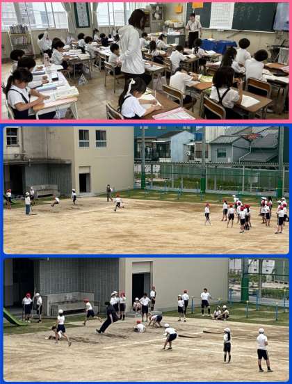 5年1組2組体育は「走り幅跳び」の学習。リズミカルな助走、力強い踏み切り、両足着地。一人一人が距離を伸ばすために、めあてをもって取り組んでいました。