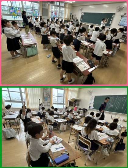 1年2組音楽の学習はカスタネットを使って。みんなで歌のリズムに乗って、楽しく演奏していました。