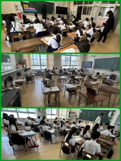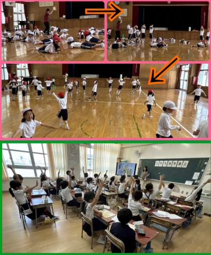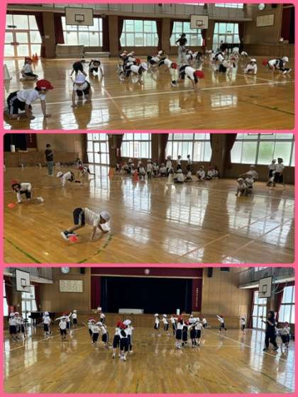 1年生体育の学習。どのクラスも講堂で全身を使って体を動かしていました。4組は表現運動。イモムシからさなぎ、そしてちょうちょになって羽ばたいていきました!