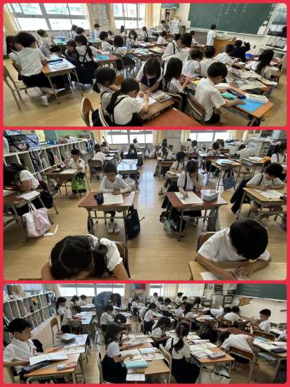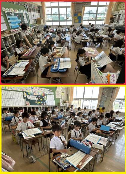 2年3組、3年2組音楽の学習。2年生は鍵盤ハーモニカ、3年生はリコーダーをリズムに合わせて演奏していました。3年生から取り組み始めたリコーダー。空いている時間やおうちでもどんどん練習していきましょうね。