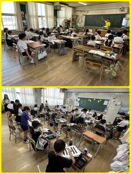 3年2組は書写。3年生から始まった毛筆の学習も今日が2回目。「一」の漢字を「トン」「スー」「ピタッ」。始筆から終筆まで意識しながら何度も何度も練習していました。