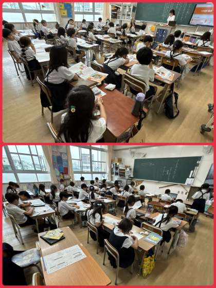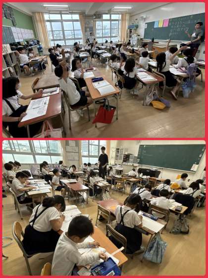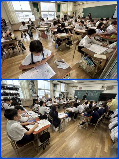 2年4組算数は復習プリント。「8センチメートルは、何ミリメートル?」「3センチ4ミリメートル+5センチ2ミリメートル=?」…、長さの単位や長さの計算を一人一人が考えていました。