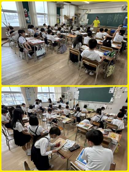 3年生の図画工作科の学習。かなづちで釘を打って作るコリントゲームが完成してきました。2組はほとんどの人が完成し、ビー玉を使ってゲームを楽しんでいました。