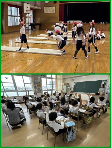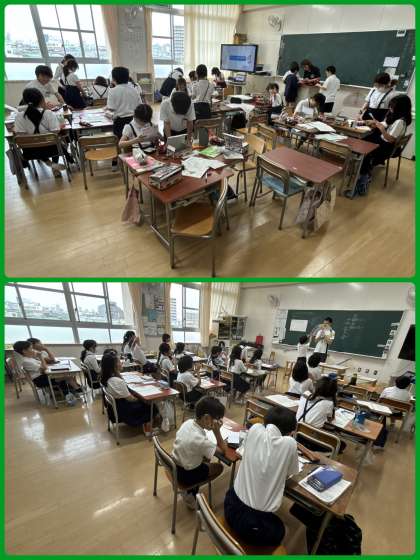 4年生の算数は「角の大きさ」の学習。2組では、大きな分度器を使って、4組はデジタル教科書で分度器の使い方をみんなで確認していました。