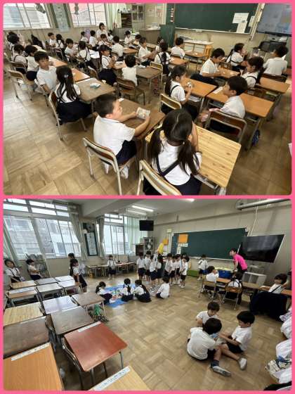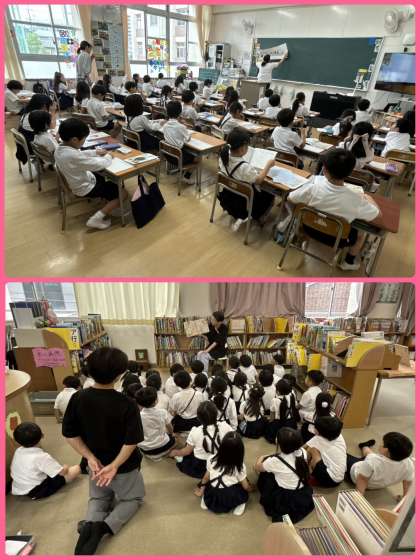 今日木曜日は図書館司書さんが来てくれる日。1年生に絵本「あさがお」の読み聞かせをしていただきました。あさがおが咲くページになると、自然に拍手がわいていました。1年生の優しい気持ちが伝わってきました。毎日水やりをしているだけに思いが溢れたのかもしれませんね。写真は2組のみなさんが読み聞かせをしてもらっているようすです。