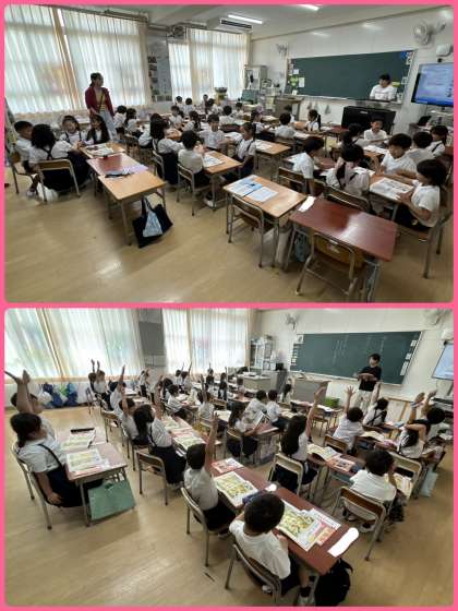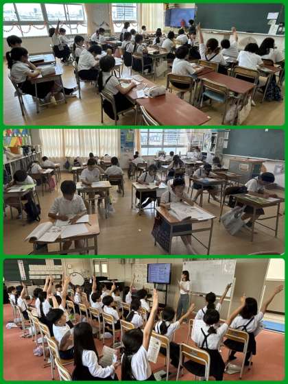 1年1組3組は音楽の学習。1組は「じゃんけん」、3組は「ぶんぶんぶん」をみんなで楽しく歌っていました。楽しさが写真から伝わりますように。