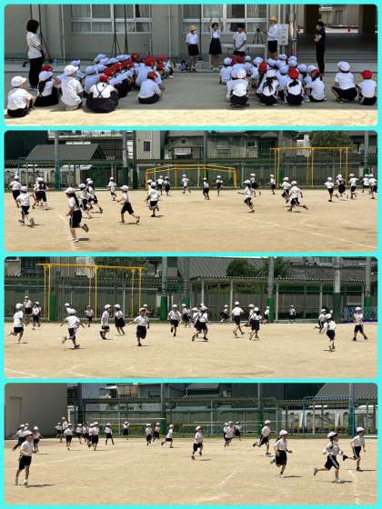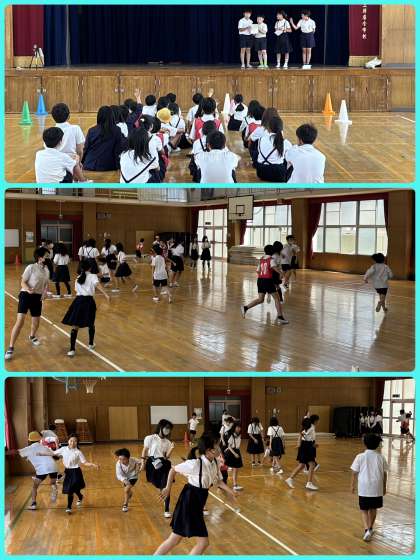今日の「ぐんぐんスポーツタイム」は、運動場で1年3組と4組、講堂で6年1組が行いました。がんがん楽しみ、ぐんぐん体力を伸ばしました!