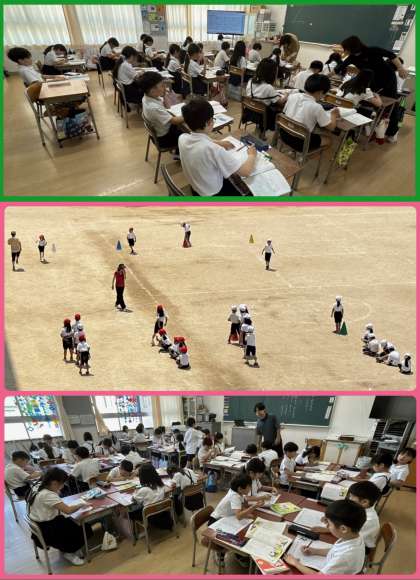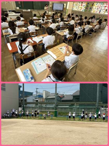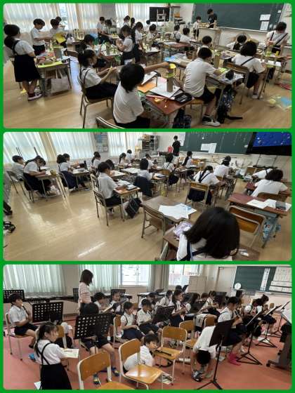 1年3組音楽の学習。「ぶんぶんぶん」の後は、「しろくまのジェンカ」。音楽に合わせてタンバリンやカスタネットでリズムを打っていました。今日も楽しく取り組んでいました。