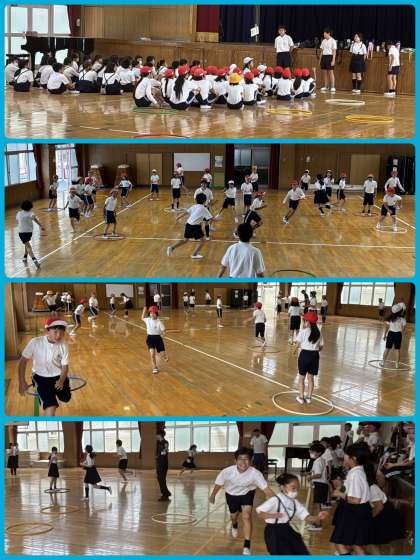 今日の「ぐんぐんスポーツタイム」は、運動場で3年1組3組、講堂で4年1組2組が行いました。がんがん楽しみ、ぐんぐん体力を伸ばしました!