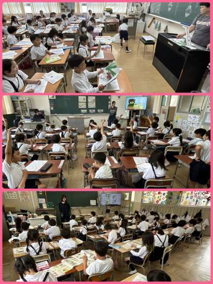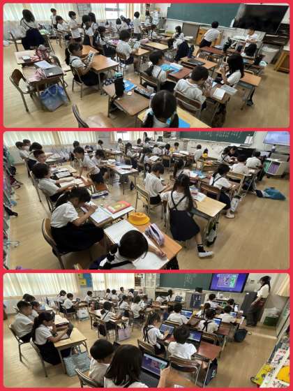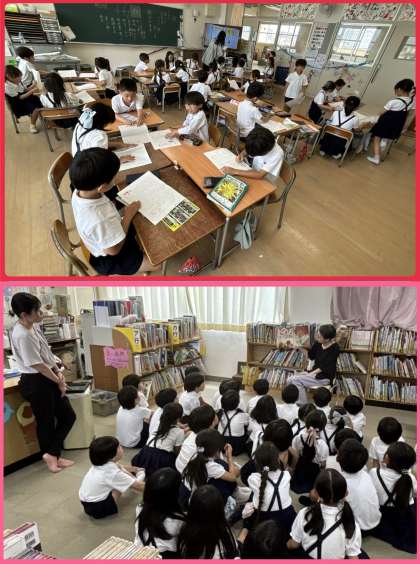 今日木曜日は図書館司書さんが来てくれる日。まずは夏休みにおススメの低学年用課題図書4冊の紹介。そのうちの1冊を読み聞かせしていただきました。この4冊は貸出できませんので、読みたい人はお昼休みに図書室へ、とお話してくださいました。懇談会中はありませんが、懇談会が終わればお昼休みに図書室に行きたい人がさらに増えるかもしれませんね。写真は想像力をふくらませて聞いている4組のみなさんのようすです。