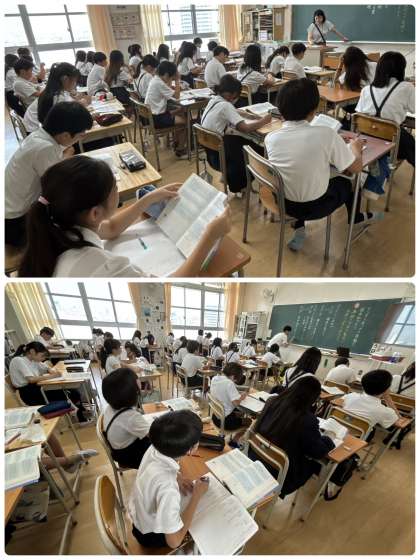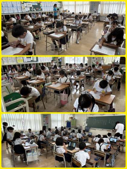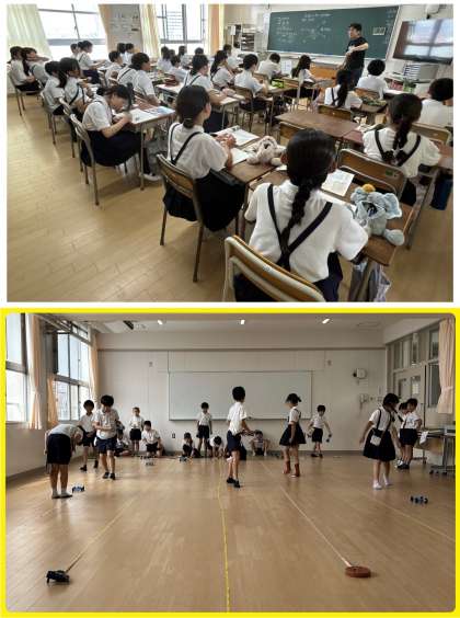 3年1組理科の学習は多目的室で。ゴムで動かす車の実験に取り組んでいました。ゴムを短く伸ばすのと、長く伸ばすのではどちらがはたらきが強くなるか、実験を通して考えていました。結果から気づいたことはあったかな?