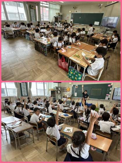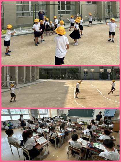 1年1組生活科の学習は「シャボン玉遊び」。見に行ったときにはほとんど終わりかけでした。残念!でも、みんなで楽しめたようです。休日や夏休みにぜひご家庭でも一緒にお楽しみください。
