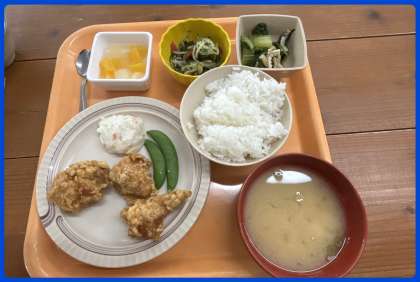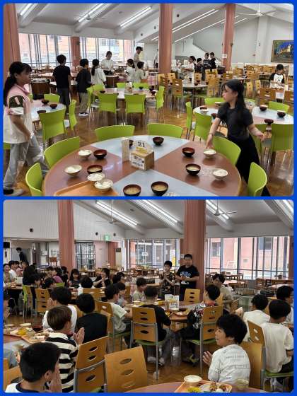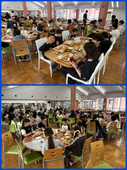 「いただきます」のあいさつ、「エッホエッホ…」と始まりました。楽しく食べられるように工夫されていました。