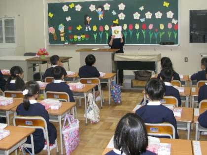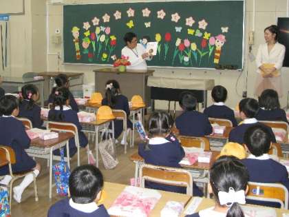 昨日までのポカポカした春の日よりは嘘のような雨・雨・雨の中の入学式でした。本年度は85名の児童が入学しました。式の後の保護者説明会の間、絵本の読み語りボランティア「お話わくわく」のみなさんに新入生は絵本を読んでいただきました。みんな絵本が大好きでした。