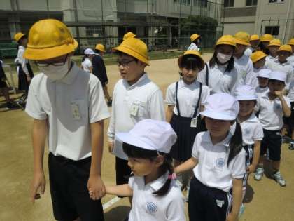 4月28日に予定していましたが、雨で今日に延期しました。1年生には6年生が2年生には5年生がそれぞれ手を引いて信号や道路をわたり、安全なあるき方について勉強しました。
