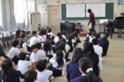 毎年の恒例です。6年生が1年生に校歌を教えます。こんなふうに歌うんだよと。6年生のみんなは1年生の口元をしっかり見て、歌い方、声の出し方など丁寧にアドバイスしていました。