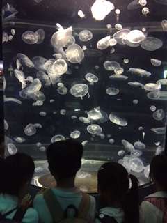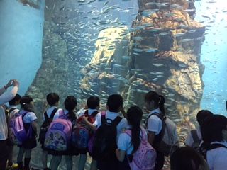 見学の様子。大きな水槽にいろいろいな魚が泳いでいます。