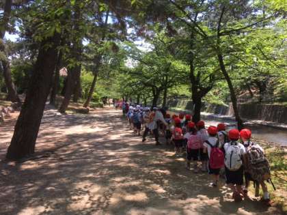 お弁当を食べて、楽しい遊具でしっかり遊んで、緑のトンネルの中を学校へ帰ります。