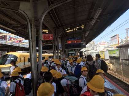 鶴橋駅で電車を待っています。みんな楽しそうにゲームなどをしています。