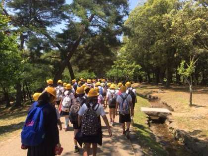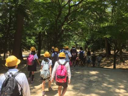 大仏殿見学の後、二月堂、三月堂を見て、興福寺方面へ奈良公園を散策。暑くってけっこう「しんどい」の声が・・・。