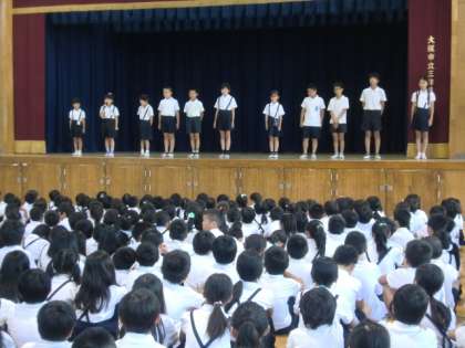 今年から終業式でその学期にがんばったことを発表することにsました。今日はそれぞれの学年から代表の人が舞台の上でんばったことをしっかり発表してくれました。