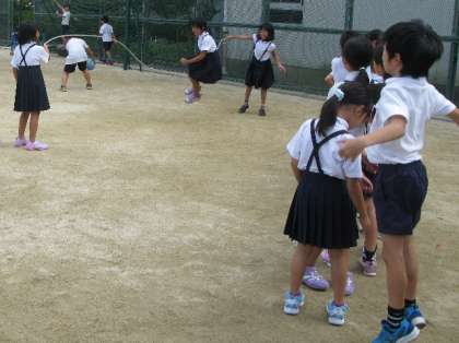 2年生2組のみんなは休み時間、元気に運動場に集まります。学級みんなで長縄に取り組んでいます。「今!」「いきや」みんなで声掛けをして楽しくやっています。みんなで連続鳶ができるようになるといいですね。