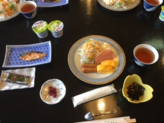 朝ご飯です。あおさのりのお味噌汁もあります。
