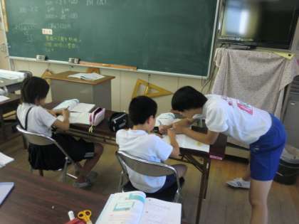 今日から2日間、美津島中学校3年の3名(本校卒業生)が就労体験に来ています。主に5年生といっしょに活動しています。